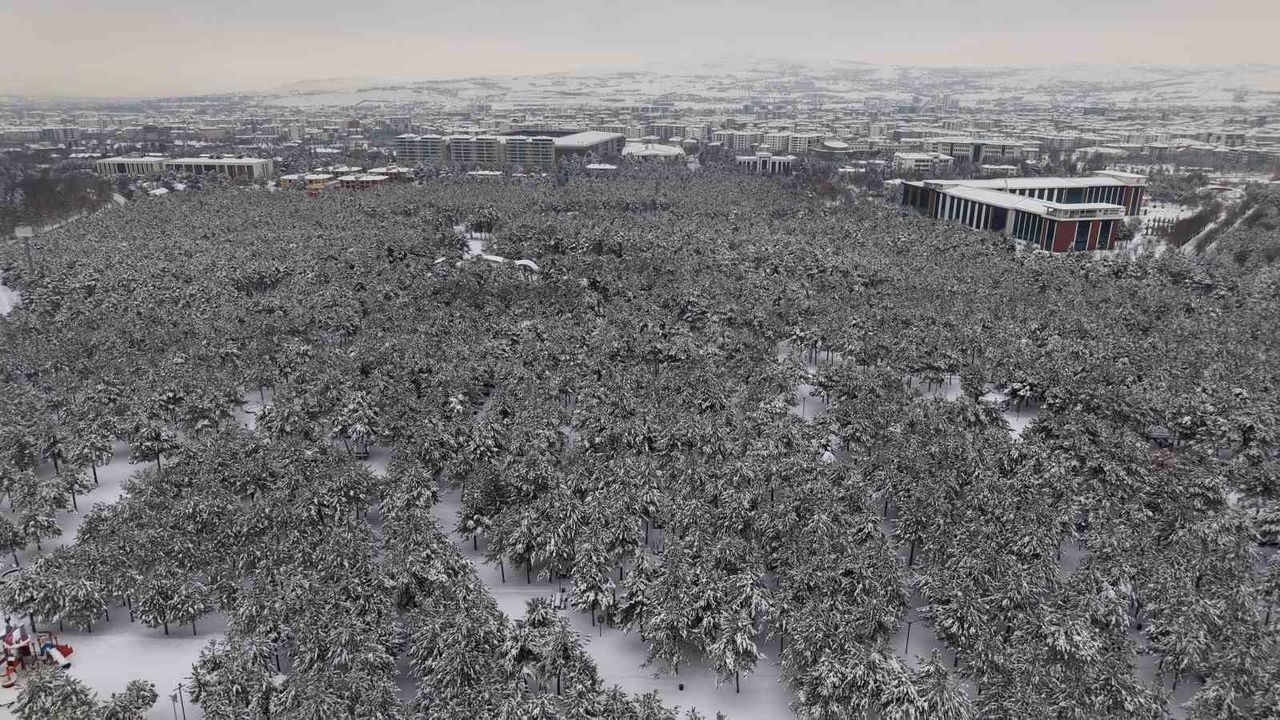 Elazığ’da kar yağışının ardından oluşan görüntüler, bu kez yüksek rakımlı dağlardan değil, şehrin merkezinden geldi. Beton binaların ve ana arterlerin çevrelediği Fırat Üniversitesi kampüsü içindeki ormanlık alan, kar yağışıyla birlikte şehir merkezinde dev bir kış bahçesine dönüştü. Genellikle kentin yüksek kesimlerinde görmeye alışık olunan yoğun kar manzaraları, bu kez Elazığ’ın en işlek noktalarından biri olan Zübeyde Hanım Caddesi’nin hemen yanı başındaki ormanlık alanda kaydedildi. Kültür Park’ın modern dokusuyla birleşen ormanlık alan, havadan görüntülendi. Dağ yollarını aratmayan kar yoğunluğunun şehrin göbeğinde sergilediği bu anlar, nadir kareler oluşturdu.