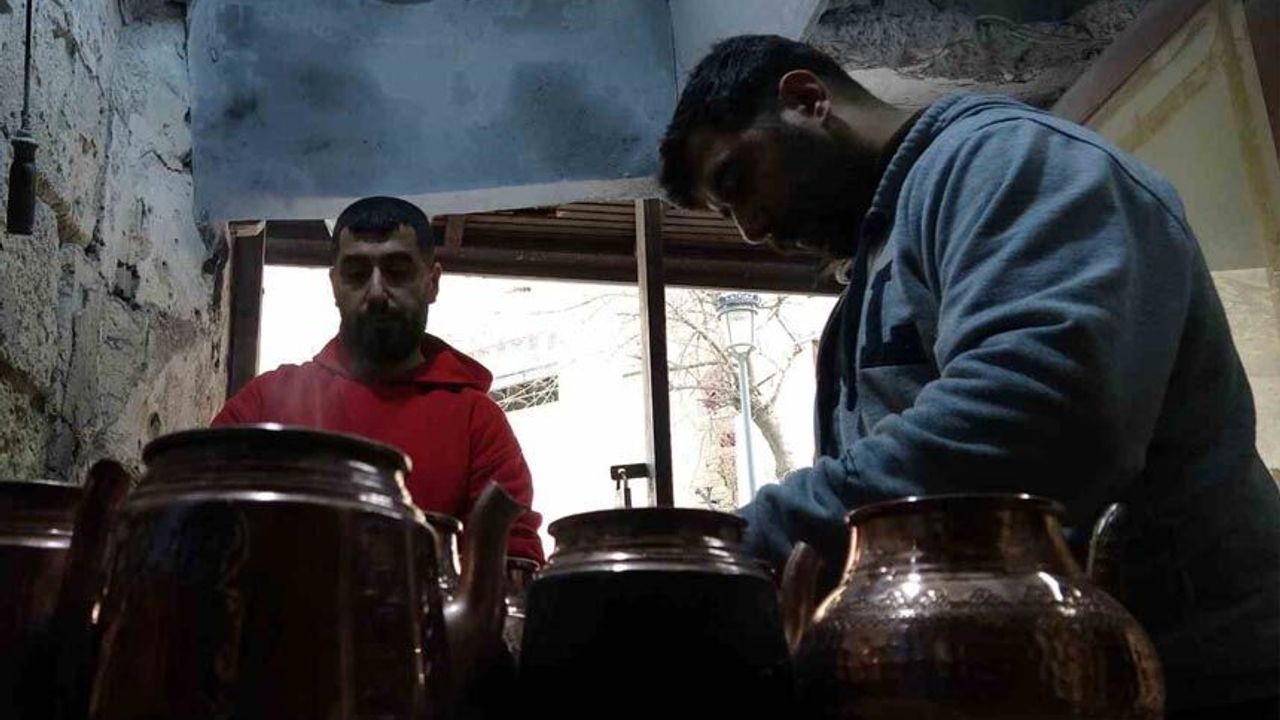 Esnaf ve vatandaşlarca getirilen bakır eşyaları ocaktaki ateşi körükleyerek kalaylayan ustalar, siparişleri yetiştirmek için büyük emek sarf ediyor.