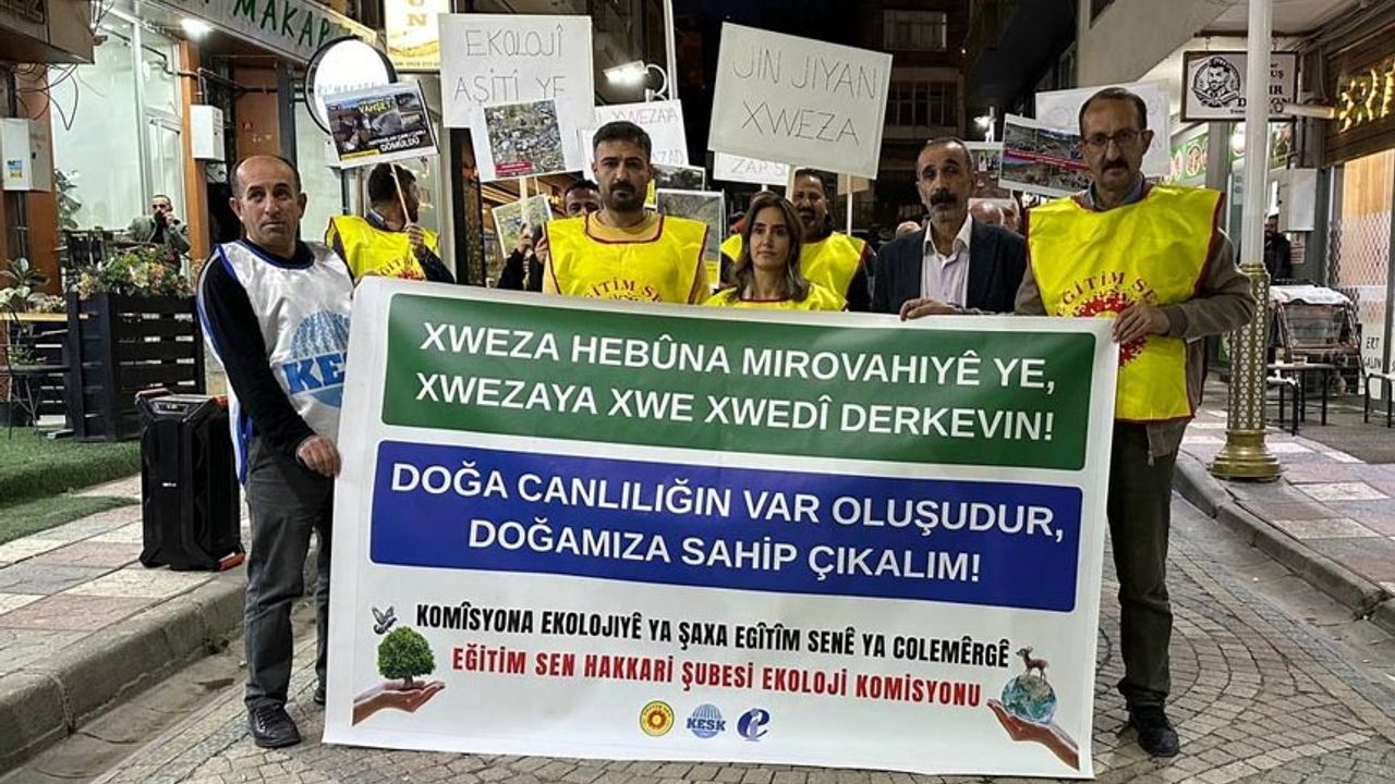 Basın açıklamasını okuyan Eğitim Sen Hakkari Şube Sekreteri Erol Taş, kapitalist sistemin doğa üzerinde yıkıcı etkiler yarattığını belirterek, “Toprağına, havasına, suyuna, ağacına sahip çıkan herkesin bu mücadelede yer alması gerekiyor” dedi. Cudi’den Besta’ya, Zap’tan Kaz Dağları’na kadar birçok bölgede doğa tahribatı yaşandığını ifade eden Taş, “Ağaçlar kesiliyor, madenler açılıyor, sular kirletiliyor. Vahşi kapitalizm doğamızı talan ediyor” sözleriyle ekolojik yıkıma dikkat çekti.