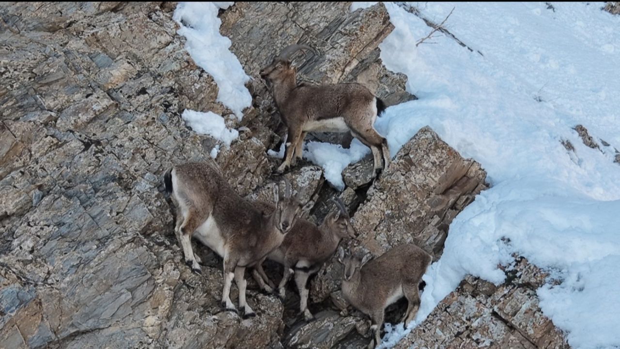 Hakkari'nin yüksek kesimlerinde kar kalınlığının yer yer artmasıyla birlikte yiyecek bulmakta güçlük çeken dağ keçileri, beslenebilmek için şehir merkezine kadar indi. Dağlık ve engebeli coğrafyasıyla çok sayıda yaban hayvanına doğal yaşam alanı sunan Hakkari’de, kent merkezinin girişine kadar gelen yaklaşık 10 dağ keçisi Sere Solan mevkisinde drone ile görüntülendi. Sürü halinde hareket eden yaban keçilerinin, karla kaplı yamaçta bir süre otladıkları, çevreyi dikkatlice kontrol ettikten sonra yeniden geldikleri dağlık alanlara doğru yönelerek gözden kayboldukları görüldü.