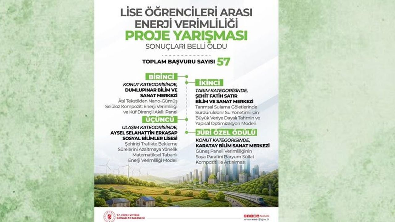Yarışmada dereceye giren projelerden, ’Atıl Tekstilden Nano-Gümüş Selüloz Kompozit: Enerji Verimliliği ve Küf Dirençli Akıllı Panel’ birincilik ödülüne layık görülürken, ’Tarımsal Sulama Göletlerinde Sürdürülebilir Su Yönetimi için Büyük Veriye Dayalı Tahmin ve Yapısal Optimizasyon Modeli’ ikinci, ’Şehiriçi Trafikte Bekleme Sürelerini Azaltmaya Yönelik Matematiksel Tabanlı Enerji Verimliliği Modeli’ ise üçüncü oldu. ’Güneş Paneli Verimliliğinin Soya Parafini Baryum Sülfat Kompoziti ile Artırılması’ adlı proje de jüri özel ödülünü kazandı.