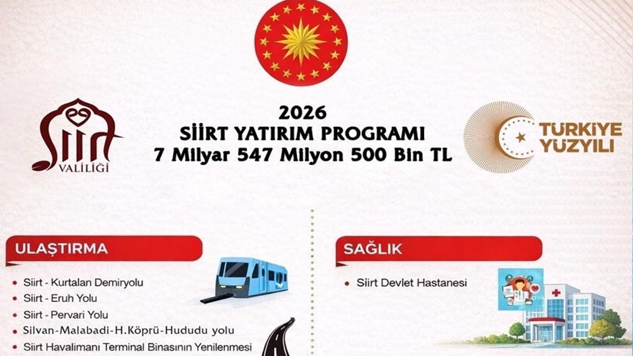 Cumhurbaşkanlığı kararı ile Siirt, 2026 Yılı Kamu Yatırım Programı kapsamında 7 milyar 549 milyon 500 bin lira tutarında yatırımla önemli bir kalkınma sürecine giriyor. Program kapsamında ulaştırma, sağlık, eğitim, enerji, tarım ve hayvancılık başta olmak üzere birçok alanda vatandaşların yaşam kalitesini doğrudan artıracak projeler hayata geçirilecek. Bu çerçevede Siirt Alkumru Barajı İçme Suyu Projesi, Siirt Ceza İnfaz Kurumu, Kurtalan Sosyal Güvenlik hizmet binası, tarımsal ürün çeşitliliğinin artırılması, bitkisel ve hayvansal üretim ile eğitim ve ihtisaslaşma alanlarında çok sayıda önemli yatırımlar programda yer alıyor.