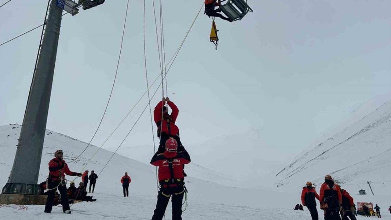 Senaryo gereği kayak merkezinde meydana gelen çığ nedeniyle elektrik kesintisi yaşanırken, telesiyejde 4 kişi mahsur kaldı. Olay yerine sevk edilen ekipler, telesiyejde mahsur kalanları güvenli şekilde tahliye ederek aşağı indirdi.