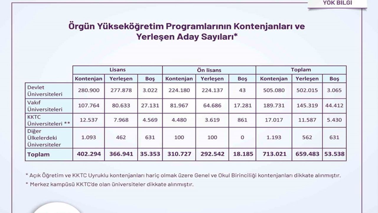 İlk yerleştirme verilerine göre, yurt içindeki devlet ve vakıf üniversitelerindeki örgün ön lisans ve lisans programlarına yerleşme hakkı kazanan aday sayısı 665 bin 54 olurken, toplam boş kontenjan sayısı 53 bin 338 olarak gerçekleşti. Devlet üniversitelerinde örgün yükseköğretim programlarına tahsis edilen toplam 521 bin 24 kontenjanın 515 bin 521’i dolarken, yüzde 99 gibi yüksek bir doluluk oranı ortaya çıktı. Vakıf yükseköğretim kurumlarındaki genel kontenjanların doluluk oranı ise yüzde 75,8 oldu.