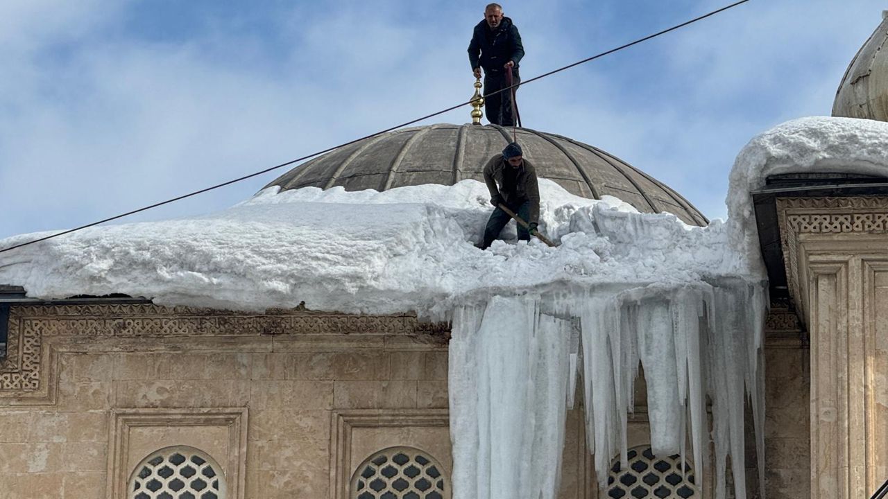 İşçiler, halatlarla sabitlenerek çatıda biriken kar kütleleri ile uzun buz sarkıtlarını kontrollü şekilde kırarak aşağıya indirmeye çalıştı.